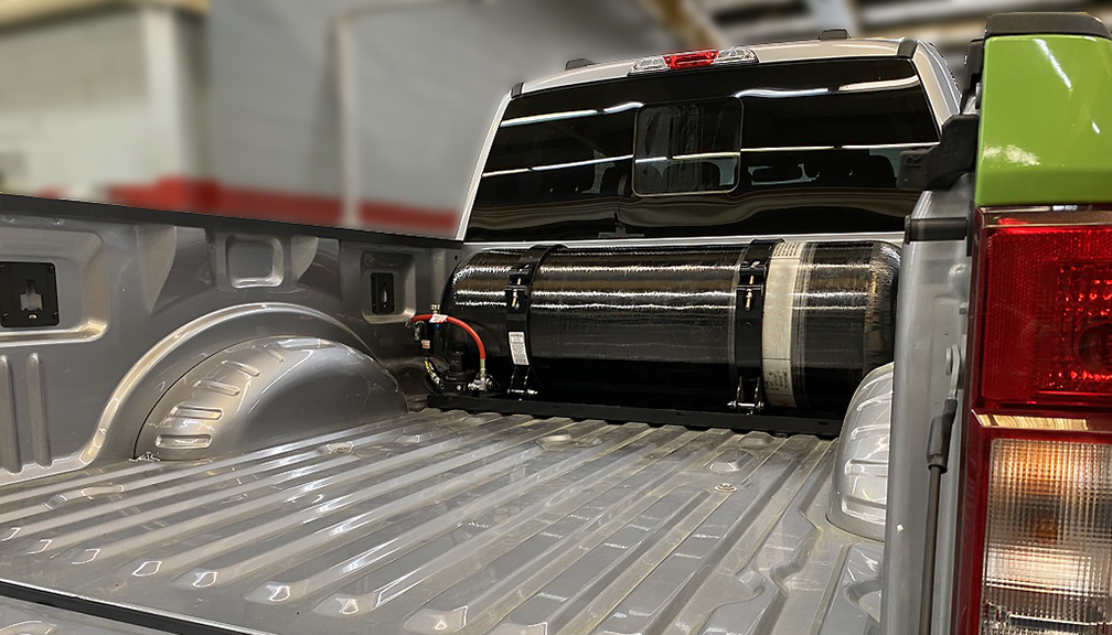 ⇛ A 900 psi low-pressure bi-fuel natural gas system (ANG 900 psi tank holds twice the volume of compressed natural gas tank at equivalent pressures).